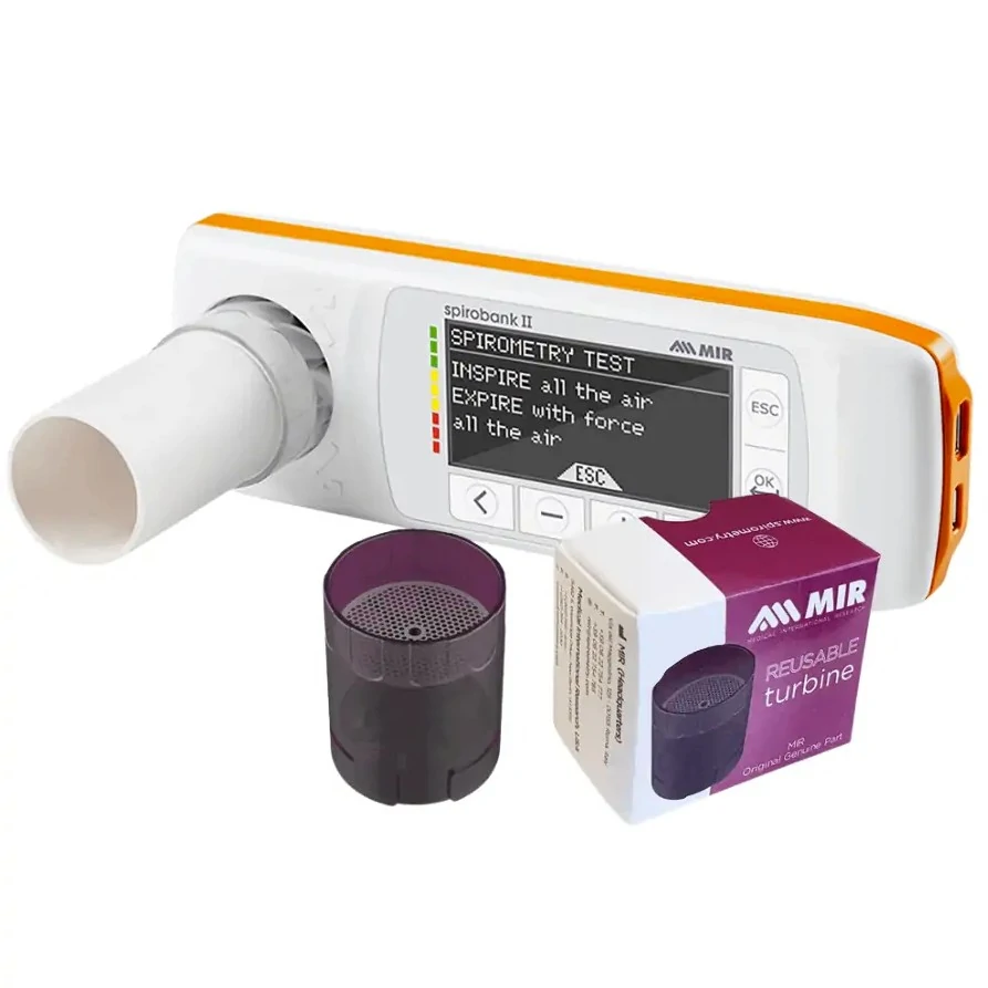 ה-MIR Spirobank II Advanced הוא פתרון ספירומטריה מקצועי ונייד המשלב דיוק קליני עם ממשק ידידותי ונוחות תפעולית – מושלם למרפאות משפחה, מרכזי נשימה, פיזיותרפיסטים ומחקר קליני. המכשיר מביא את טכנולוגיית ה-spirometry המתקדמת אל הכף היד: מדידות מהירות, עקומות זרימה בזמן אמת ותמיכה הן בטורבינות חד-פעמיות FlowMir והן בחיישני זרימה רב-שימושיים — כשהכל מכוייל מראש וללא צורך בכיול שוטף.