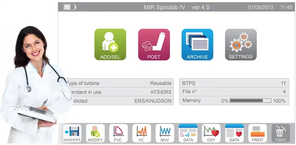 ה-Spirolab® מסוגל למדוד נתוני FVC, FEV1, IVC, MVV ומגוון רחב של פרמטרים נוספים — כ-30 ערכי תפקוד שונים — כולם מוצגים בצורה ברורה ונוחים לניתוח. בנוסף, המכשיר מאפשר ביצוע מבחני PRE/POST להערכת תגובה פרמקודינמית, כלי חיוני לאבחון ברונכוקונסטריקציה ולבדיקות אתגר מתאימות.