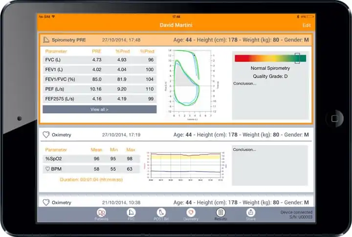 חיבור USB למחשב מאפשר ביצוע בדיקות בזמן אמת באמצעות תוכנת MIR Spiro Platinum – פתרון מתקדם התואם להנחיות ATS 2019 וכולל גרפים בזמן אמת, תצוגת LLN, חישוב Z-Score ומגוון ערכים תקניים ממקורות כגון GLI, Nhanes, ERS, Knudson ועוד. דרך האפליקציה או המחשב ניתן למדוד פרמטרים מדויקים כמו FVC, FEV1, FEV1/FVC%, PEF, FEF25–75 ועוד למעלה מ־40 פרמטרים נוספים.